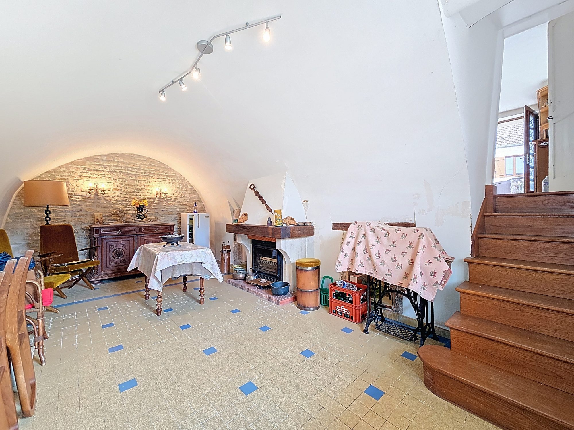 En demi-palier inférieur, vous serez charmé par une superbe pièce voûtée avec cheminée, pleine de cachet, idéale pour un salon cosy, une salle de réception ou un espace de détente unique.